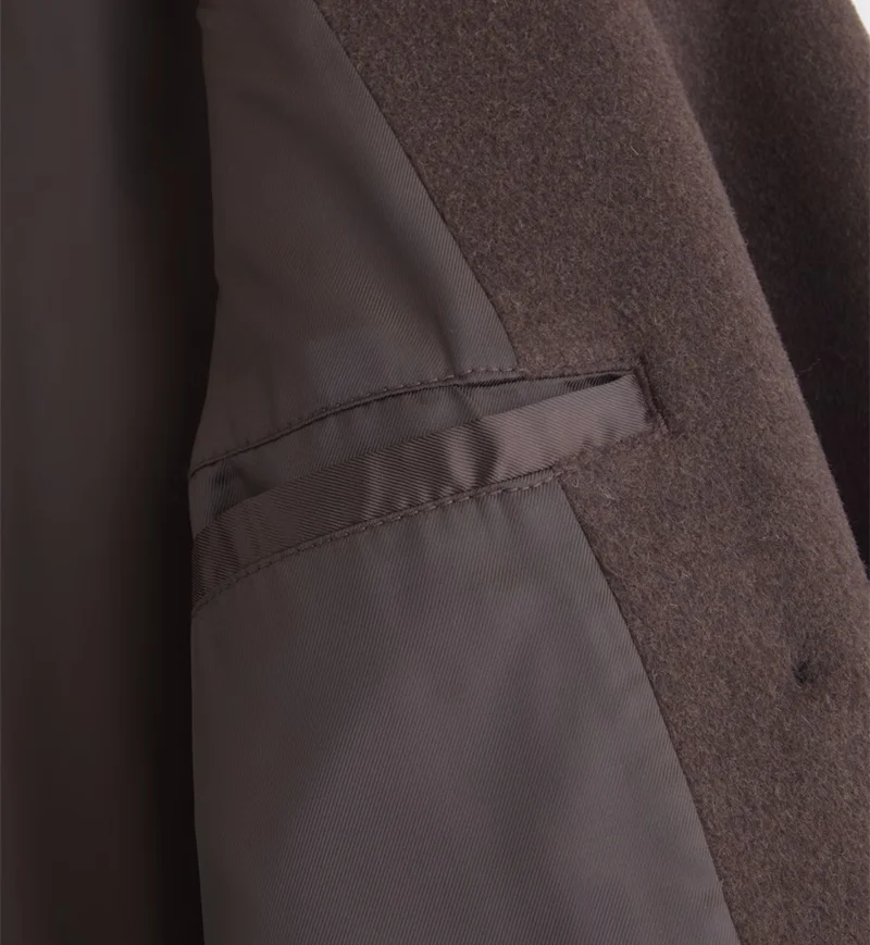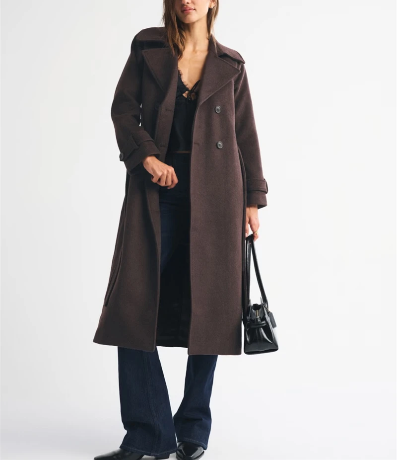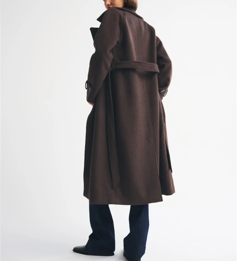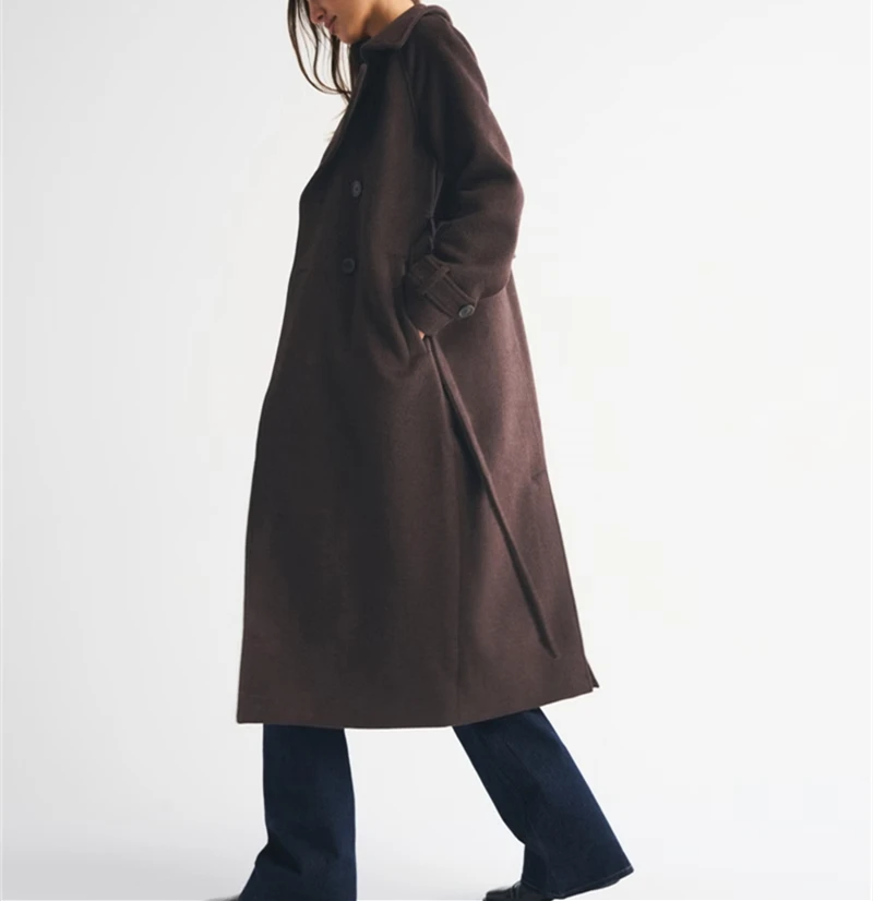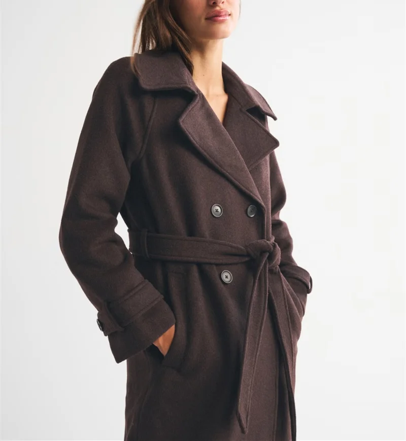 Customized High Quality Wholesale Ladies Fashion Classic Double-Breasted Brown Wool Coat with Belt